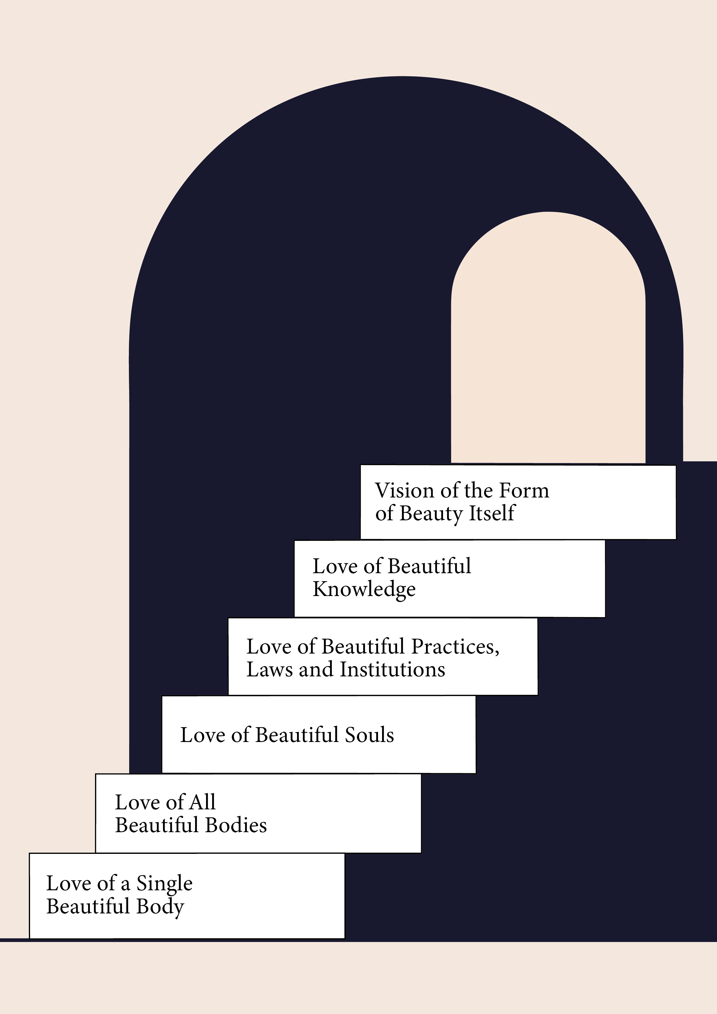 Plato on the other hand, explored love in his Symposium (c. 385 – 370 BC) through Diotima’s Ladder of Love. In the text, Diotima describes love as a process of education and transformation, a gradual ascent from desire for the particular to love of the eternal and universal. In Diotima’s view, love is the engine that moves humans from desire to meaning, from possession to participation and from fear of loss to intimacy with the infinite. Each step of the ladder includes the previous one but loosens attachment, expands care, and deepens understanding. From the first steps of physical desire to a specific body and all bodies, to the love of souls and knowledge and to the final step where the lover perceives beauty itself as not embodied in one thing. The ladder shifts a human from loving things that are beautiful to loving beauty as a principle of being.